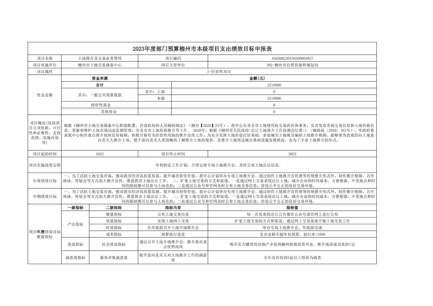 柳州市土地交易储备中心2023年项目支出绩效目标申报表.xls